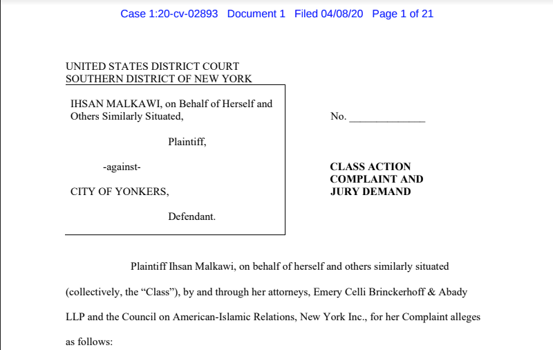 READ COMPLAINT HERE: https://www.cair-ny.org/s/Complaint-Malkawi-v-City-of-Yonkers.pdf